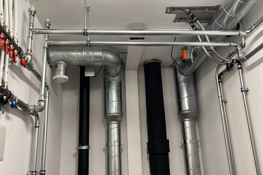 Installation complète d’un système de renouvellement d’air contrôlé à double flux avec récupération de chaleur, conforme au standard MINERGIE, en collaboration avec HRS Real Estate SA.